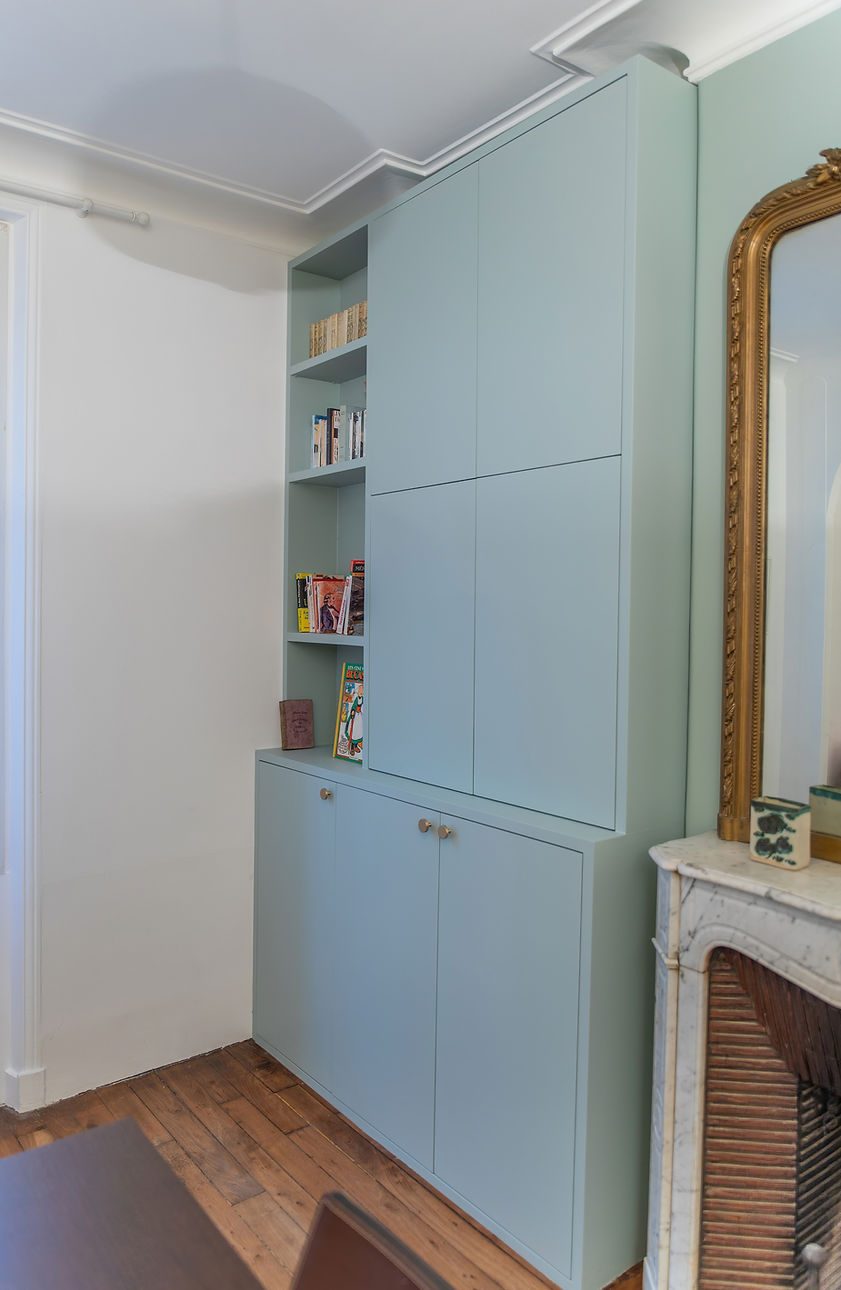 L'objectif de ce projet a été de permettre à la propriétaire de cet appartement de gagner le plus de rangements possibles: nous avons donc dessiné des meubles et étagères sur-mesure exploitant au mieux les hauteurs et niches de cet appartement.